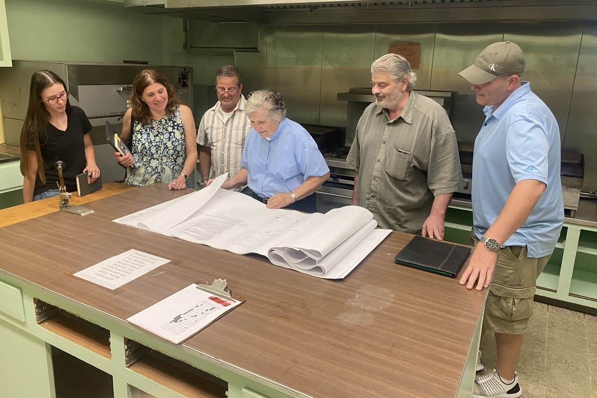 Cypress House Bakery, a nonprofit based in a building attached to St. Luke’s Episcopal Church in downtown Scranton, Pennsylvania, is a training program that will teach formerly incarcerated people baking and culinary skills. Here, the program’s operations manager, Brian Goble, far right, reviews kitchen renovation plans with architects and construction managers, including the Rev. Susan Treanor, center right, an Episcopal priest who previously ran a construction management consultant agency. Photo: Helen Wolf