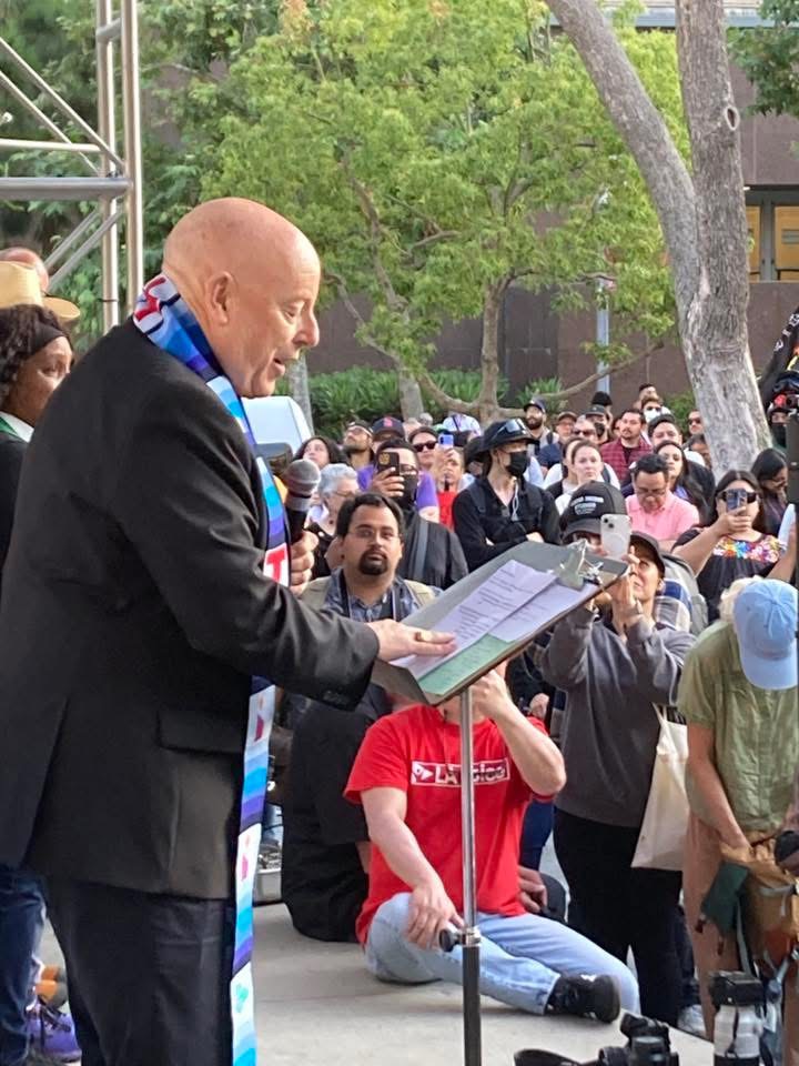 Organized by L.A. Voice and PICO California in partnership with other community and faith groups, including the Episcopal diocese, the vigil was moderated by Jesuit priest Brendan Busse of Dolores Mission and opened with an invocation by Father Greg Boyle, the Jesuit founder of L.A.’s Homeboy Industries, a nonprofit specializing in rehabilitation of former gang members.