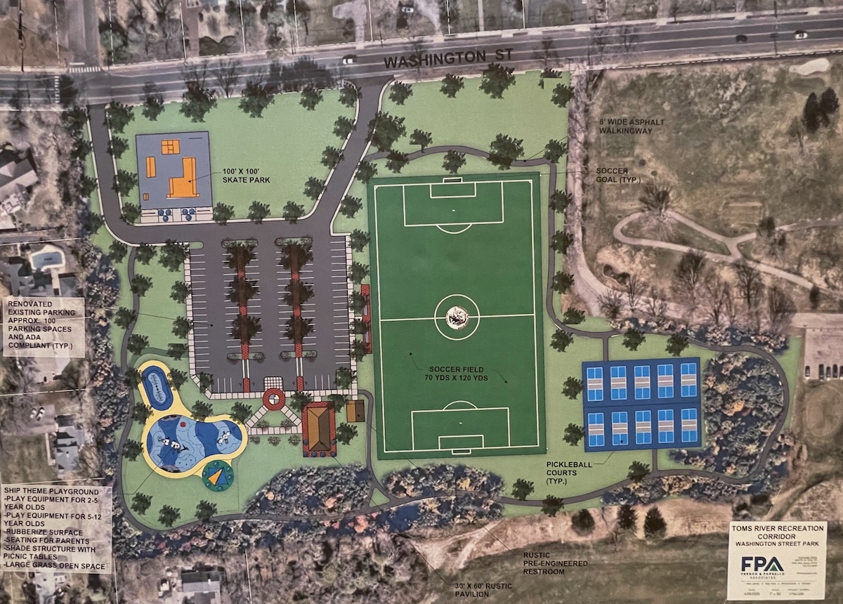A schematic shown at the meeting details Toms River Mayor Daniel Rodrick’s plan for the Christ Episcopal Church land, including pickleball courts, a soccer field, a playground and a skate park. Photo: Mary Frances Schjonberg/ENS
