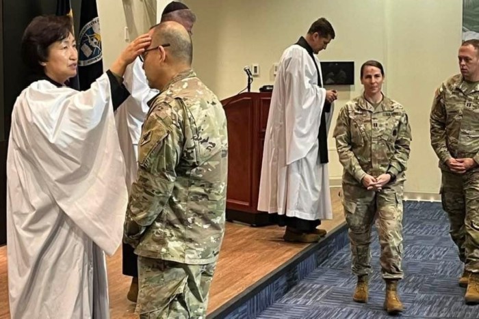 The Rev. Grace Kim, a chaplain and licensed counselor serving in the U.S. Army, imposes ashes on soldiers on Ash Wednesday. Photo: Courtesy of Grace Kim