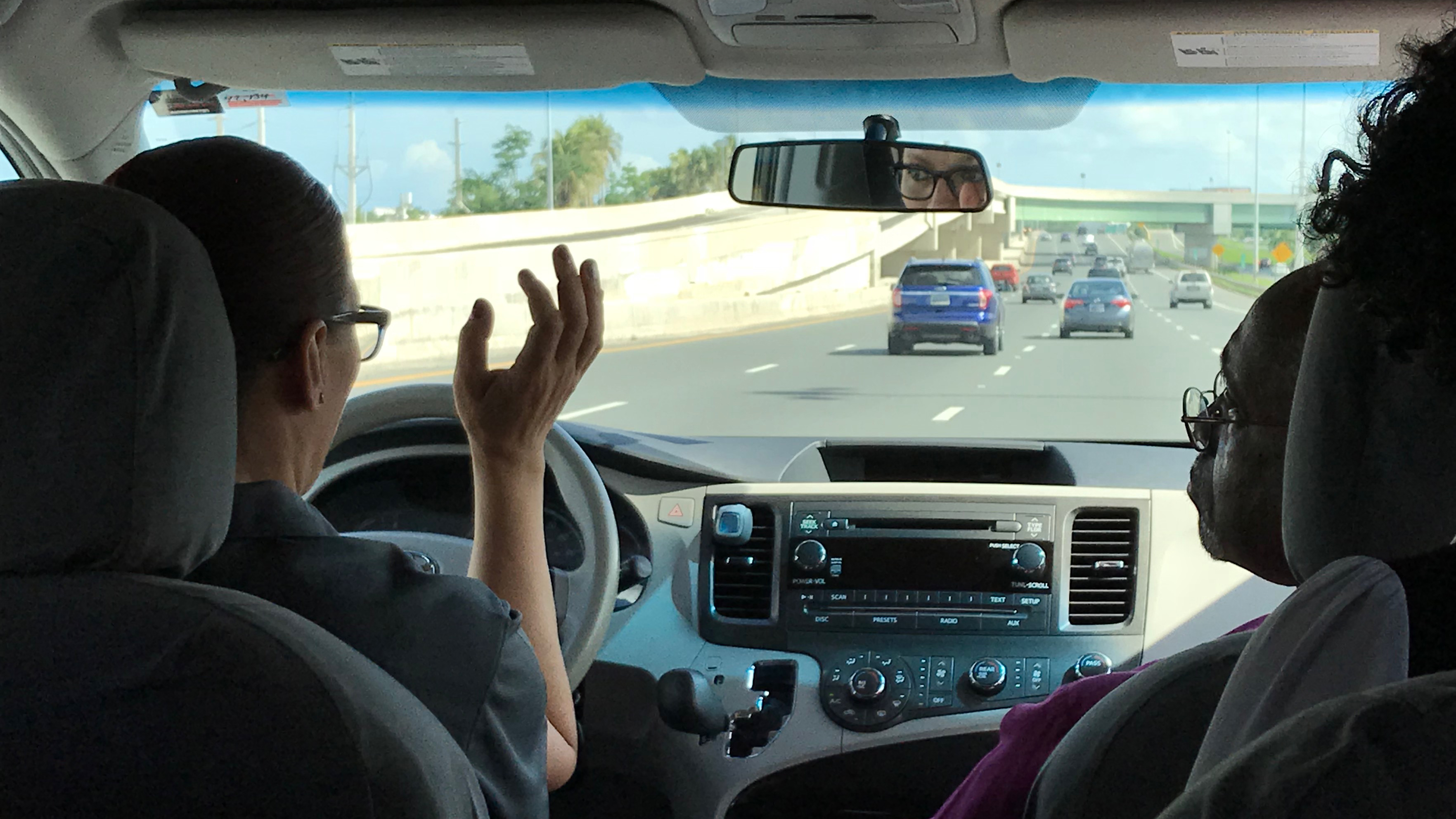 Damaris DeJesus, left, discusses Puerto Ricans’ mix of despair and hope during the drive from Toa Baja back to San Juan on Jan. 3 with Presiding Bishop Michael Curry, right, and an Episcopal Church delegation. Photo: David Paulsen/Episcopal News Service
