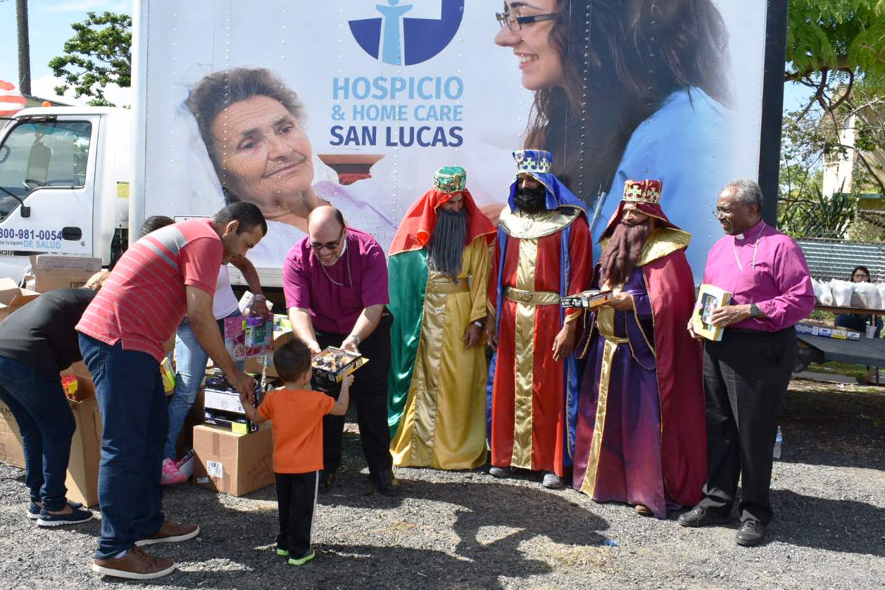 Puerto Rico Bishop Rafael Morales gives a toy to a child during a pop-up medical clinic that doubled as a hurricane relief station Jan. 3 in Toa Baja. Presiding Bishop Michael Curry, far right, who was on a two-day pastoral visit, helped distribute the toys alongside three costumed Wise Men. Photo: David Paulsen/Episcopal News Service