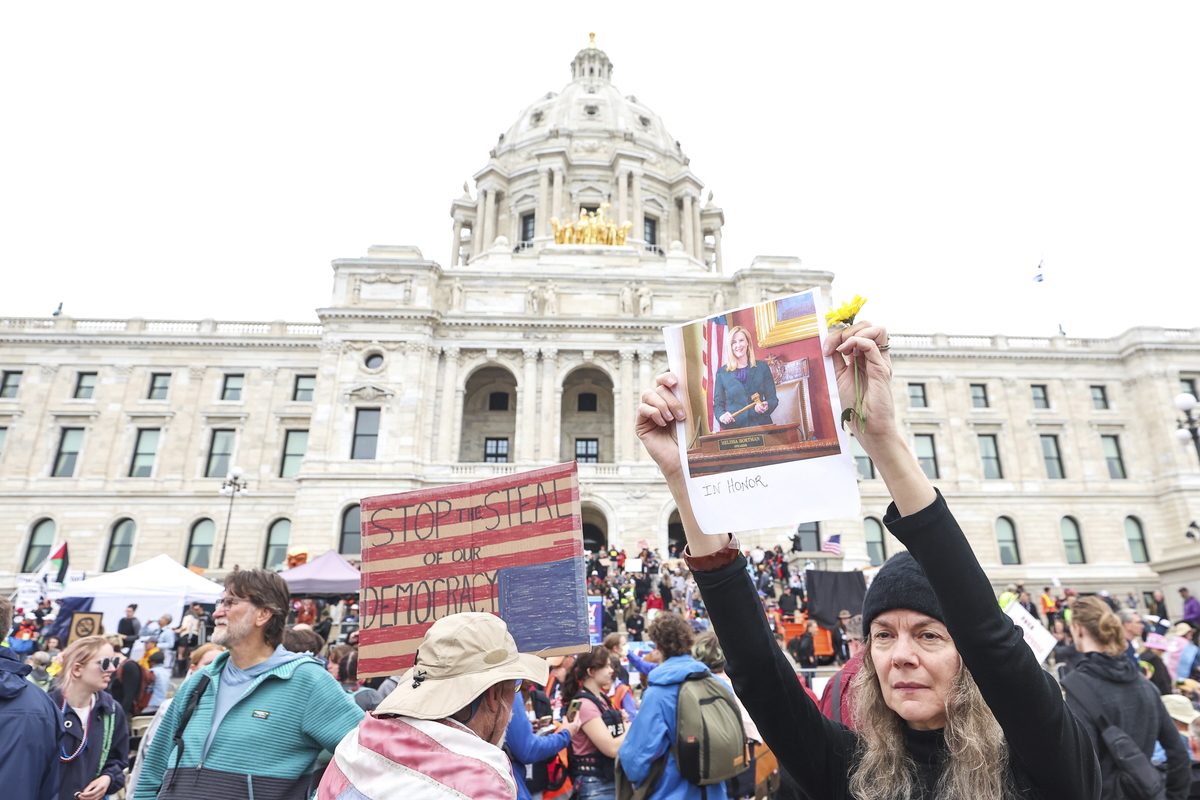 A demonstrator holds a picture of Minnesota state Rep. Melissa Hortman, who was killed by a gunman hours before a “No Kings” protest at the Minnesota State Capitol in St. Paul on June 14, 2025. Photo: Steven Garcia/AP