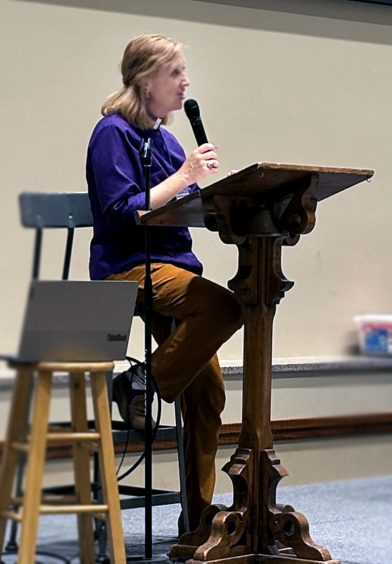 Kansas Bishop Cathleen Bascom addresses the Episcopal Grasslands Network gathering April 26 in Topeka. Bascom helped write the General Convention resolution that authorized creation of eco-regions in The Episcopal Church. Photo: Melodie Woerman/ENS
