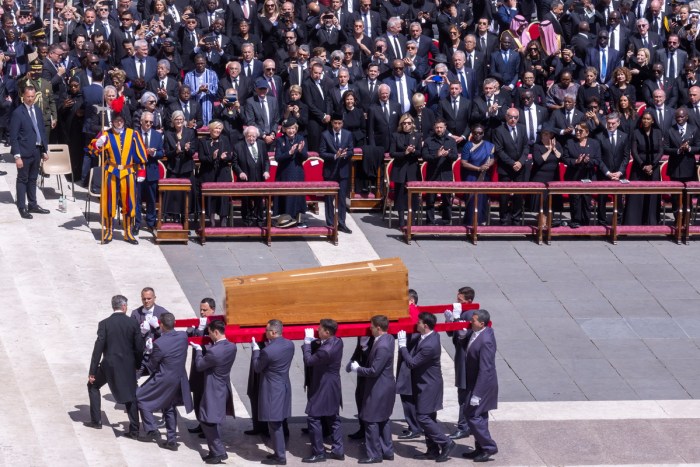 Pallbearers carry the coffin at the end of the funeral of Pope Francis in St. Peter’s Square. Vatican city, April 26th, 2025. Photo: Rocco Spaziani/AP