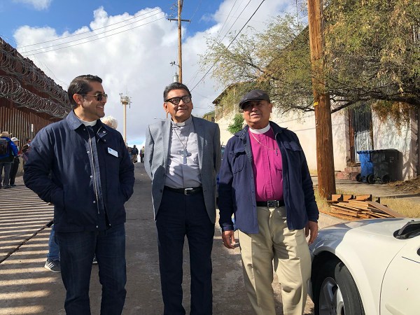 The Rev. David Chavez, left, the Diocese of Arizona’s border missioner, Western Mexico Bishop Ricardo Gómez Osnaya, center, and El Salvador Bishop Juan David Alvarado walk along the border wall in Nogales, Arizona, as part of a November 2019 Episcopal Border Ministries Summit. Photo: Lynette Wilson/Episcopal News Service
