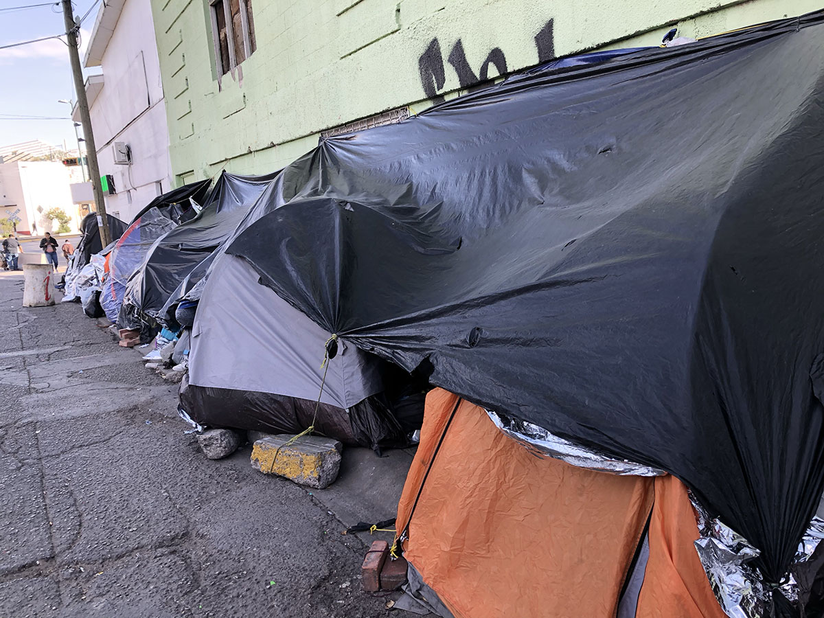 Tent cities have taken stake at the foot of the three bridges on the Juárez side of the U.S.-Mexico border where Mexican nationals – two-thirds of them families – are waiting to claim asylum in the United States. Photo: Lynette Wilson/Episcopal News Service