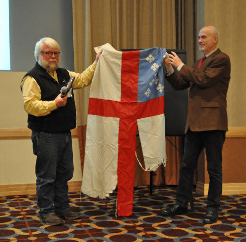 The Rev. John Floberg, left, and Mark Duffy, director and canonical archivist of the Archives of The Episcopal Church, hold the Episcopal flag that flew over a North Dakota encampment of demonstrators during the 2016 fight against the Dakota Access Pipeline. The flag was turned over to the Archives during an October 2016 meeting of Executive Council. Photo: Mary Frances Schjonberg/Episcopal News Service