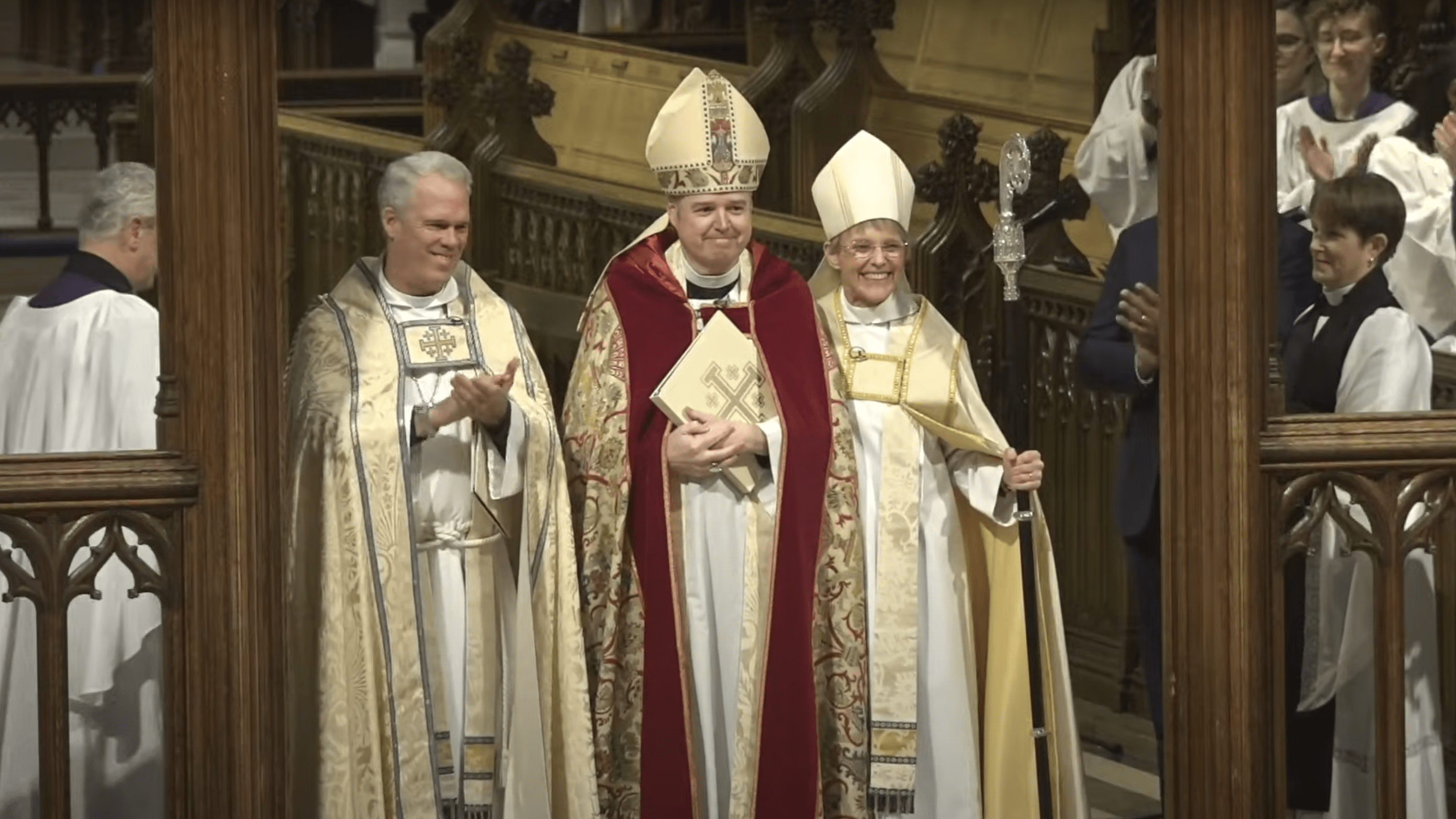 Washington National Cathedral Dean Randy Hollerith, left, and Washington Bishop Mariann Budde, right, present Presiding Bishop Sean Rowe to the congregation after his ceremonial seating at the cathedral on Feb. 2, as seen in the cathedral’s video of the service.