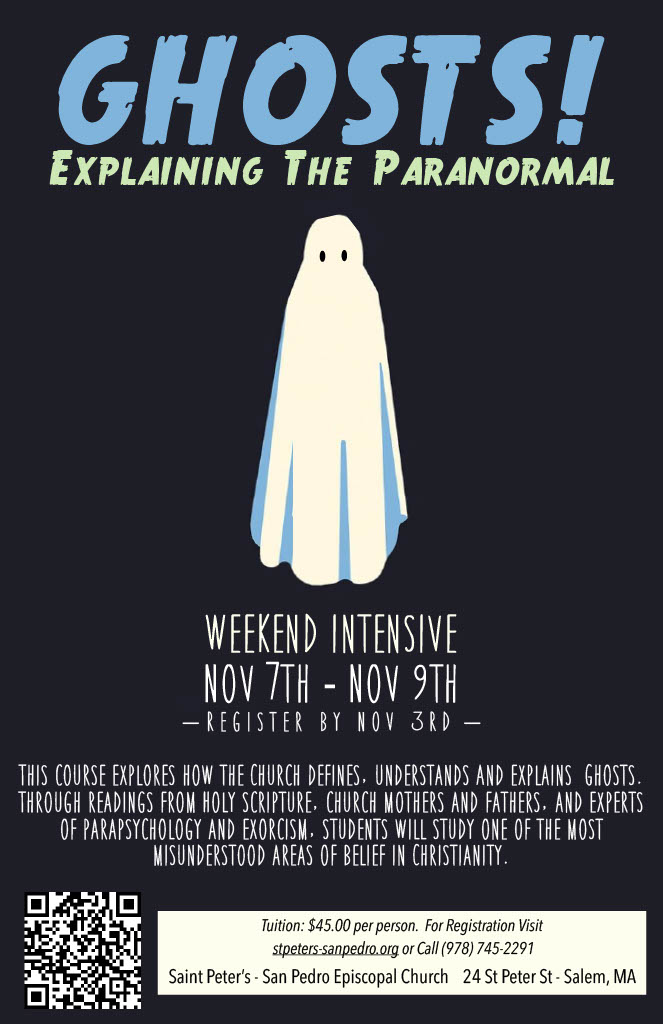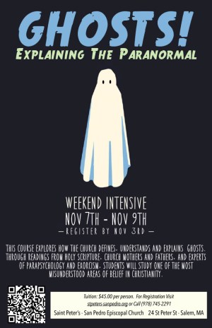 Poster advertising “Ghosts! Explaining the Paranormal,” a three-day intensive course on understanding ghosts, exorcisms and parapsychology through Scripture, taking place Nov. 7-9 at St. Peter’s-San Pedro Episcopal Church in Salem, Massachusetts. Photo: Courtesy of Eric Fialho