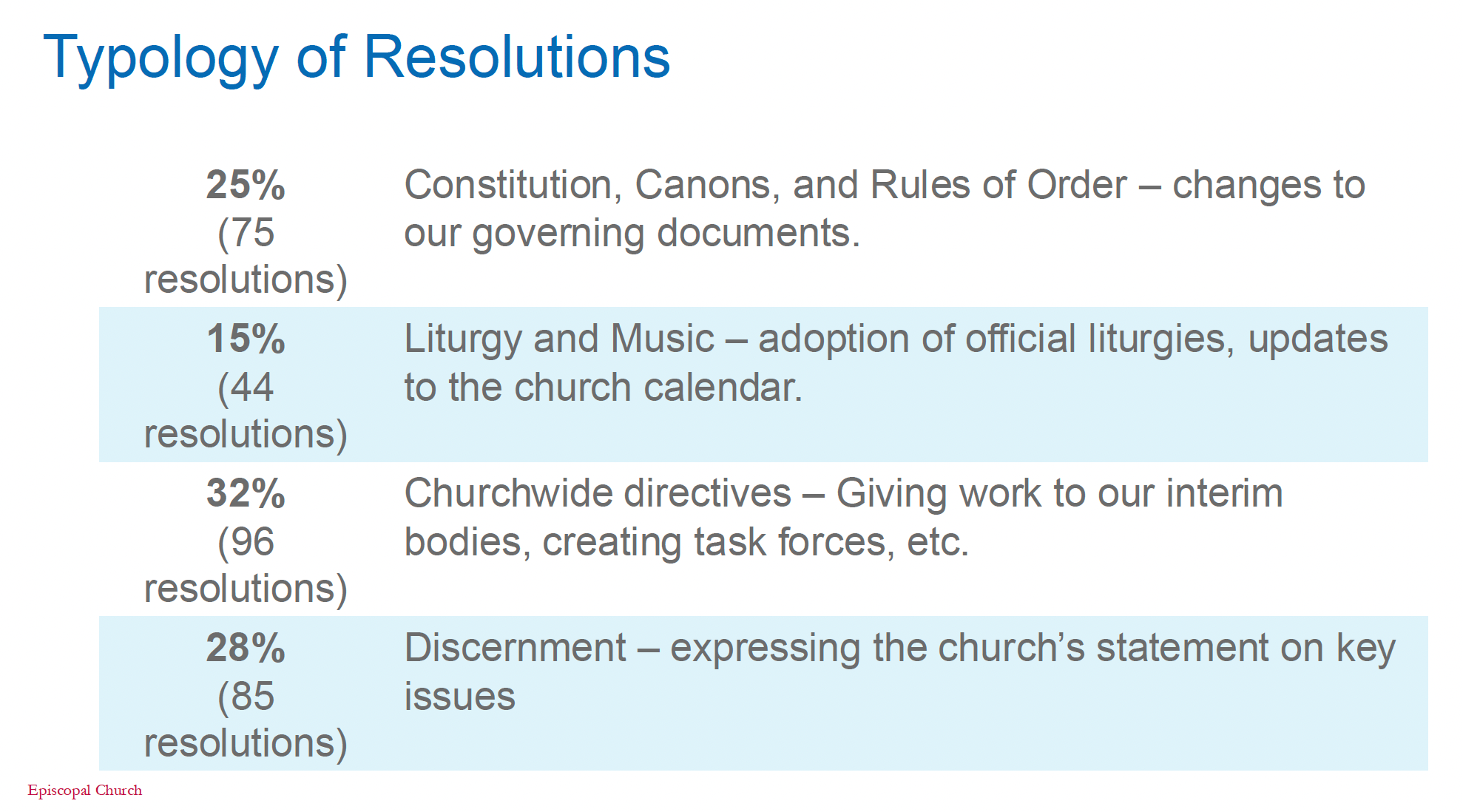A slide presented by the Rev. Scott Gunn to Executive Council on Oct. 21 shows the breakdown of resolutions from the last General Convention into four categories.