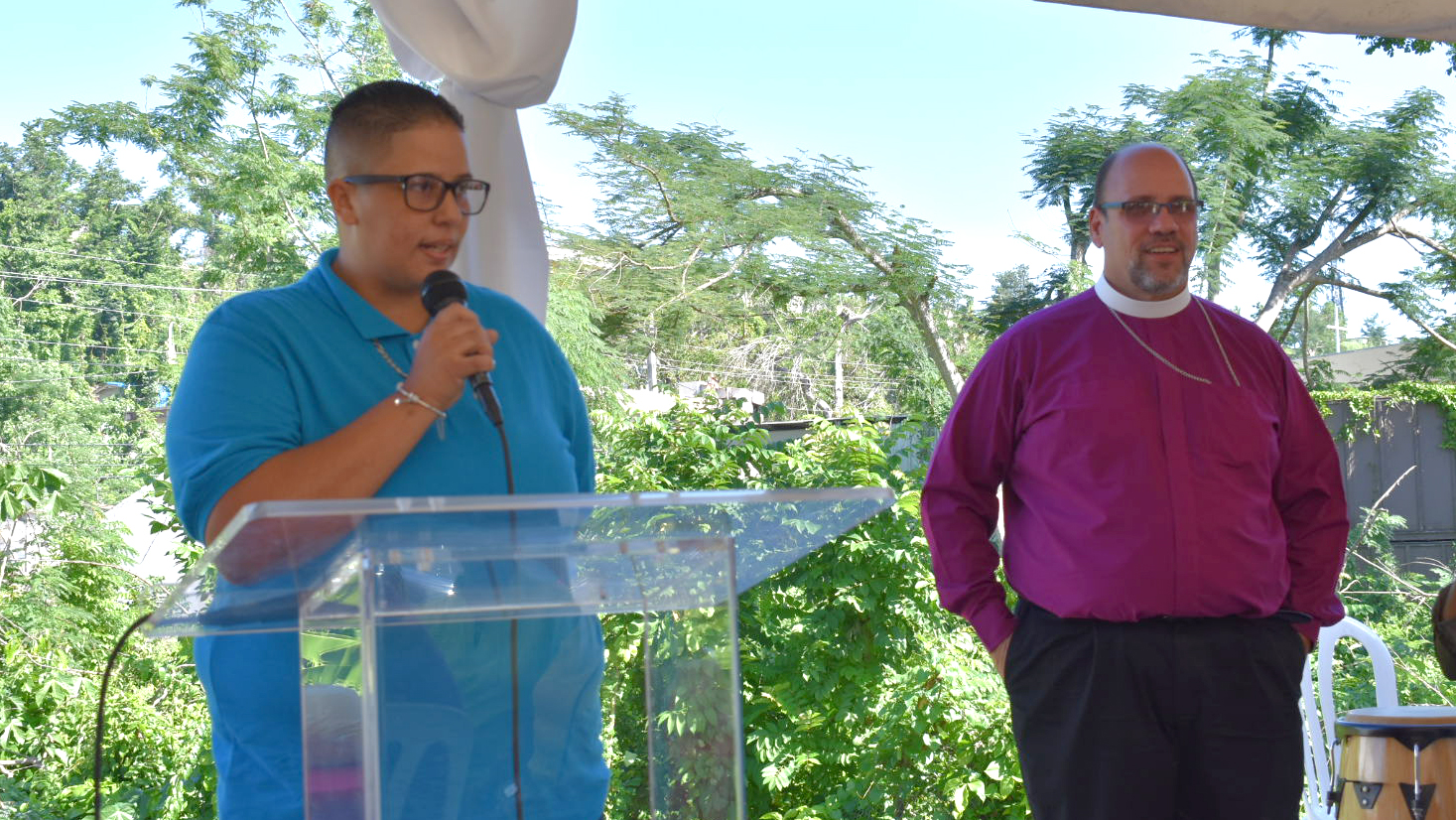 The tent had been raised on a large concrete slab in front of the main building, and it served as a symbol of resurrection as Morales spoke of how God has guided the diocese forward. The hurricane destroyed a provisional church building that stood on that concrete slab, which now supported a gathering filled with fellowship and resolve.