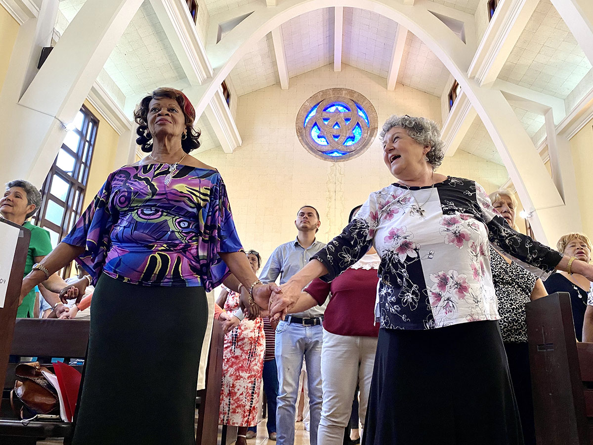 Congregants hold hands while singing during the Eucharist celebrating the Diocese of Cuba’s readmission into The Episcopal Church. Photo: Lynette Wilson/Episcopal News Service