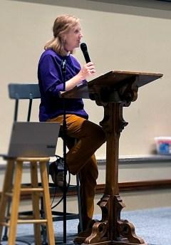 Kansas Bishop Cathleen Bascom addresses the Episcopal Grasslands Network gathering April 26 in Topeka. Bascom helped write the General Convention resolution that authorized creation of eco-regions in The Episcopal Church. Photo: Melodie Woerman/ENS