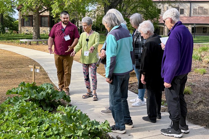 Willie Madl (left) and Ann Palmer point out rhubarb and strawberries growing at Bethany House and Gardens in Topeka, Kansas, on April 25 to some of the people attending the Grasslands Eco-region Network gathering. Madl is groundskeeper for the gardens, and Palmer helped design them. Photo: Melodie Woerman/ENS