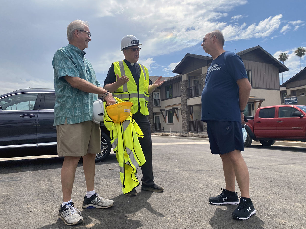 Tom Johnson, junior warden, left; the Rev. Barrett Van Buren, rector; and Ned Bergert, senior warden, stand on the 3.8-acre lot at Church of the Blessed Sacrament in Placentia, California, before a $33-36 million senior citizen housing project was completed on site. Photo: Lynette Wilson/Episcopal News Service