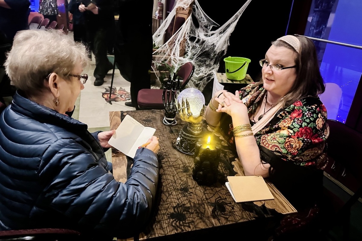 Selena Arnt, right, portraying the fictional charlatan medium, Selene Ravenloft, in the Oct. 10 murder mystery dinner fundraiser hosted by St. Andrew’s Episcopal Church in Valparaiso, Indiana, shares with a participant, left, her supposed relationship with the “murder victim.” Photo: Shireen Korkzan/ENS