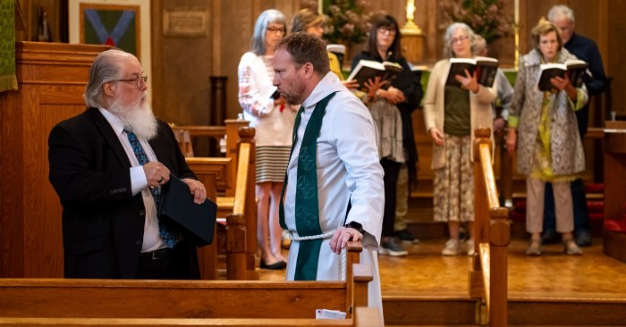 Pastor Michael Marcela and the Rev. Robert Hartmans check in with each other on a Sunday morning. Photo: Kyla Willoughby